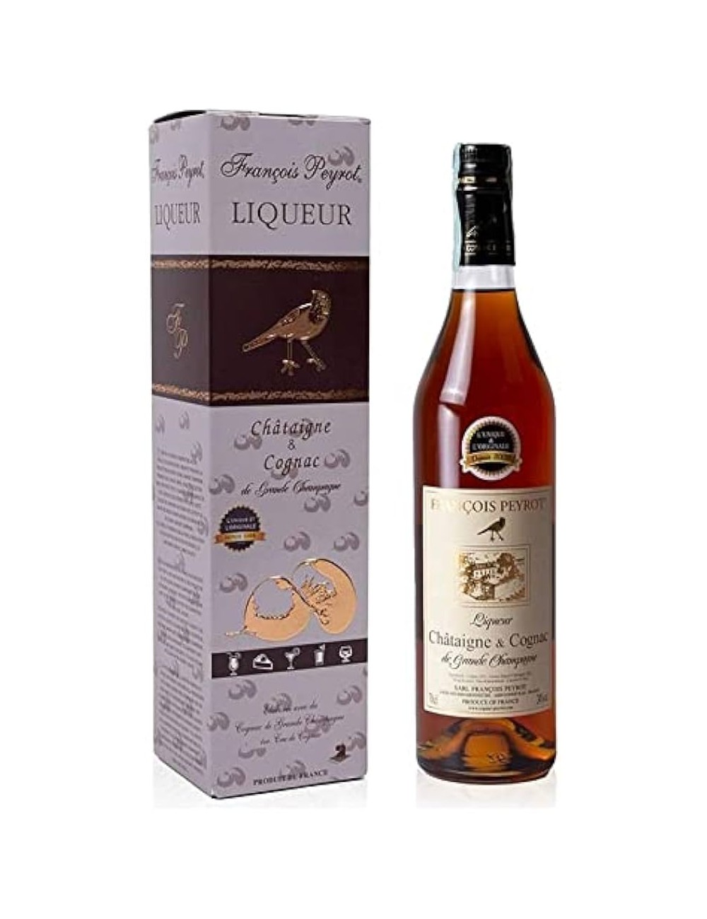 Il Liqueur Au Cognac Chataigne è un distillato di alta qualità realizzato dalla cantina francese Peyrot. La coltivazione dei vigneti segue i principi dell'agricoltura biodinamica, che non prevedono l'utilizzo di trattori e di chimica di sintesi, ne in vigna, ne in cantina.. La distillazione del vino bianco base si svolge attraverso il classico metodo dell'alambicco charentais e prevede un doppio passaggio del mosto a fuoco diretto. Il cognac è poi lasciato maturare per almeno due anni in barrique di quercia francese. Deve il suo nome al caratteristico aroma di marron glacés, che ne contraddistingue la gamma olfattiva. Una percentuale di caramello va a renderlo leggermente più dolce e ne arricchisce ulteriormente il gusto.