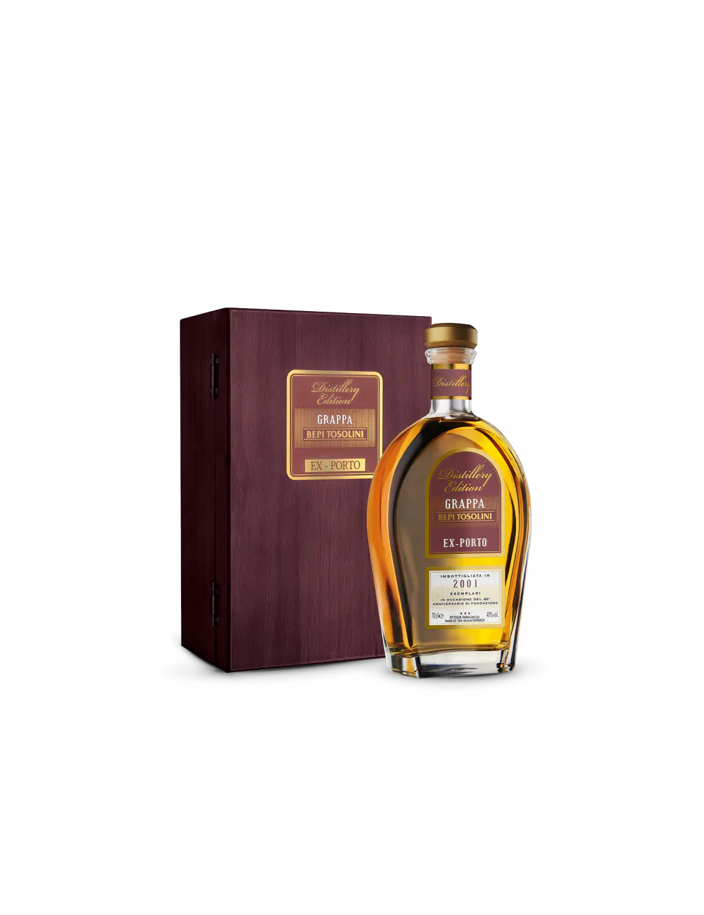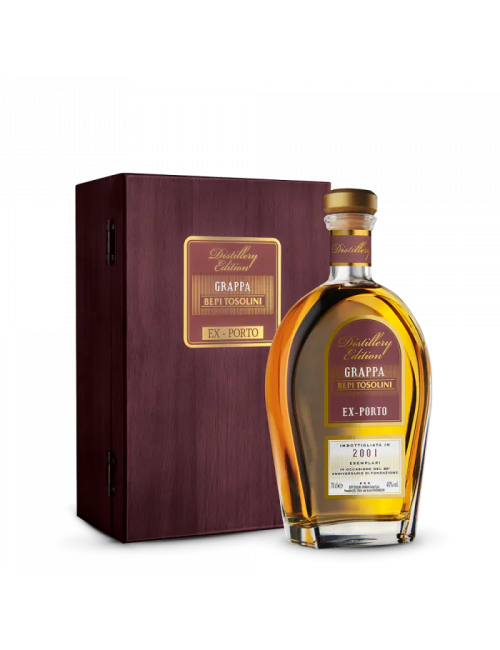 Distillata secondo il “metodo Tosolini”, un processo di distillazione che preserva gli aromi delle materie prime selezionando solo uve più pregiate e lavorando le vinacce fresche di vendemmia entro 48 ore. La distillazione avviene in alambicchi artigianali, che vengono utilizzati per ottenere grappe e acquavite raffinate ed equilibrate. Questa grappa è stata selezionata per l’invecchiamento in botti di rovere americano di Ex - Porto nelle cantine di famiglia. Un accurato blend molto ricco al palato con avvolgenti note di vaniglia, uvetta, spezie dolci e nocciole. Imbottigliata in 2001 esemplari.