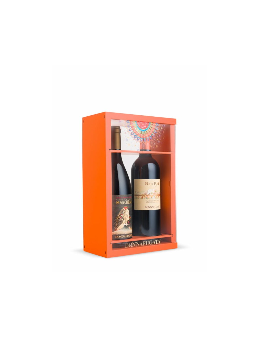 Una confezione dedicata ai vini icona Donnafugata: grandi etichette dalla personalità unica, vini inimitabili e longevi per vivere un’esperienza esclusiva e memorabile. L’innovativa teca in legno e plexiglass decorato a rilievo contiene 2 bottiglie da 0,75 L: Contrada Marchesa Etna Rosso DOC 2019, alc 13.5 % vol. Ben Ryé Passito di Pantelleria DOC 2020, alc 14.5 % vol.
